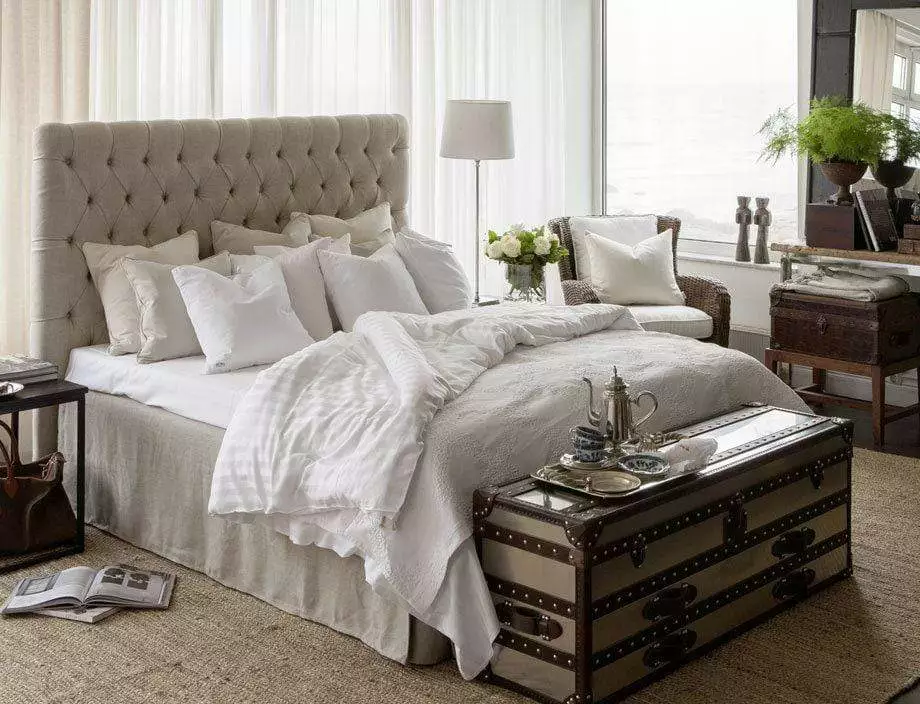 Sänggavel från Artwood med ekben. Sänggaveln ställs direkt på golvet mellan väggen och sängen. Den stoppade knappade delen börjar 45 cm upp.