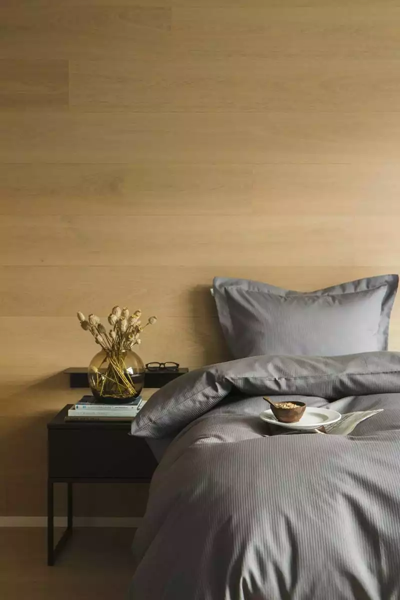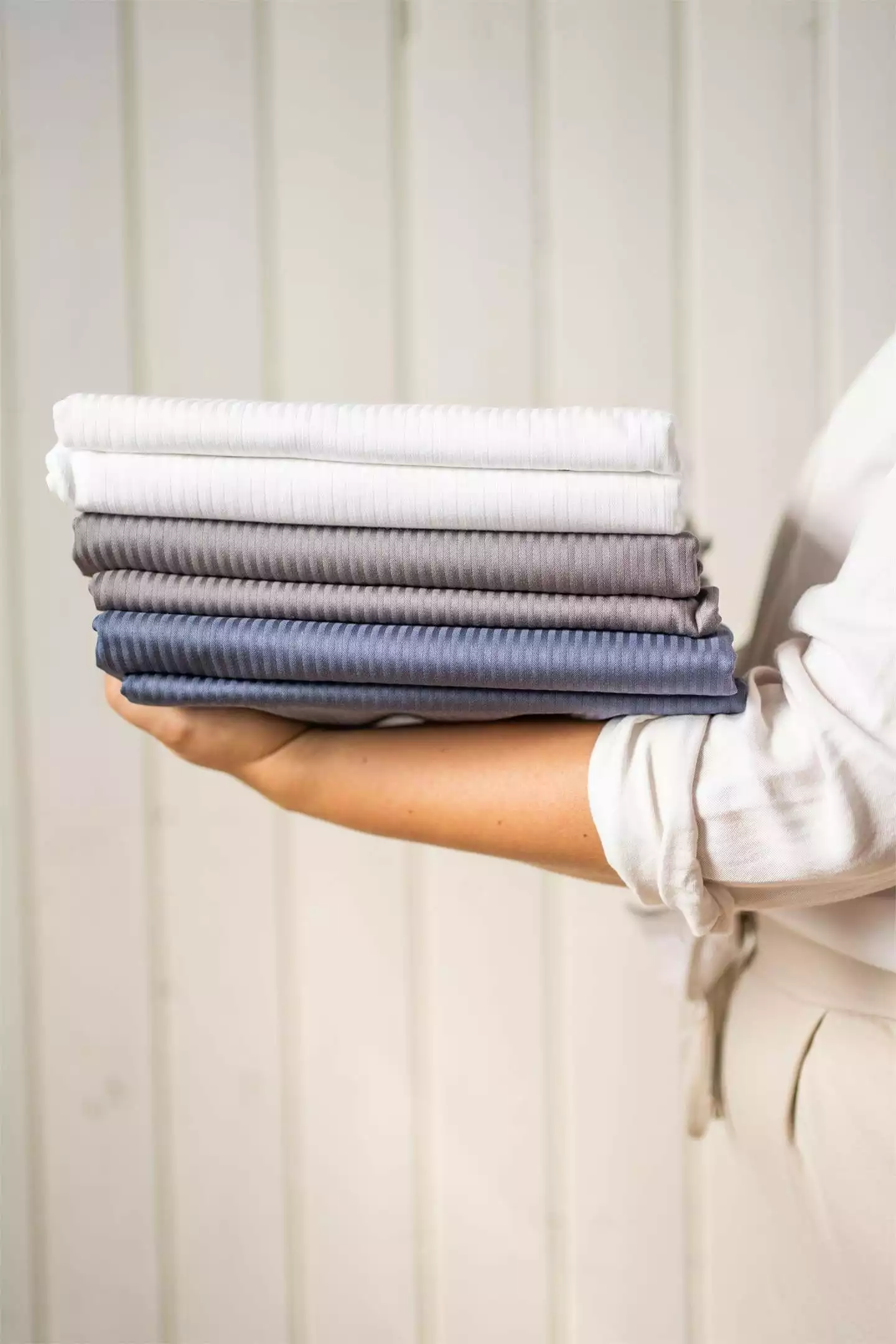 Premium sängkläder i satin vävd av fin ekologisk bomullstråd i smala klassiska ränder. Klassiskt, elegant och inte minst tidlöst för de kvalitetsmedvetna som uppskattar lyx – varje dag.