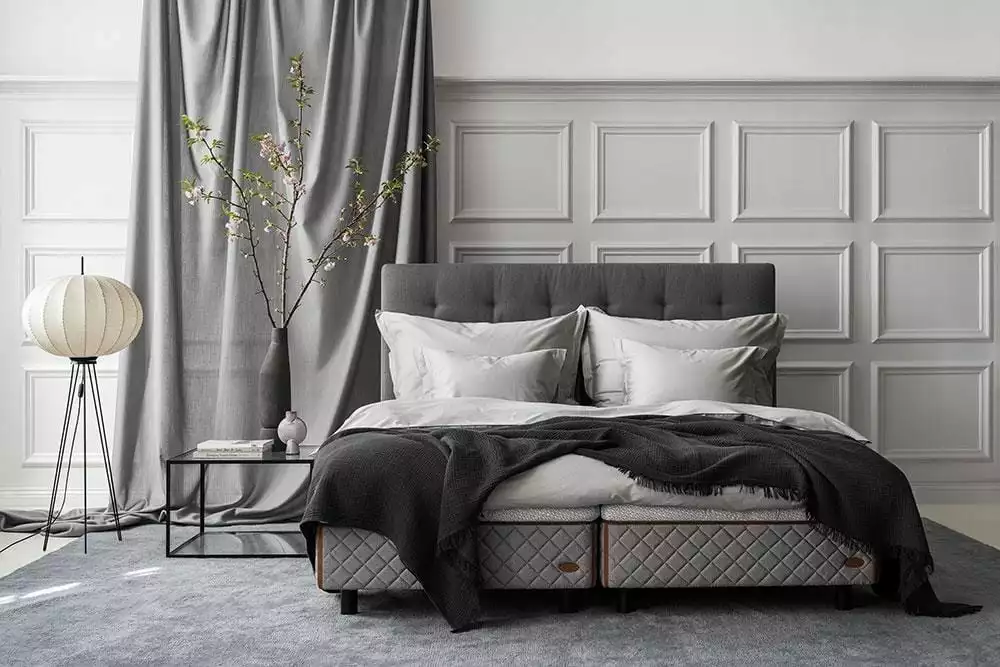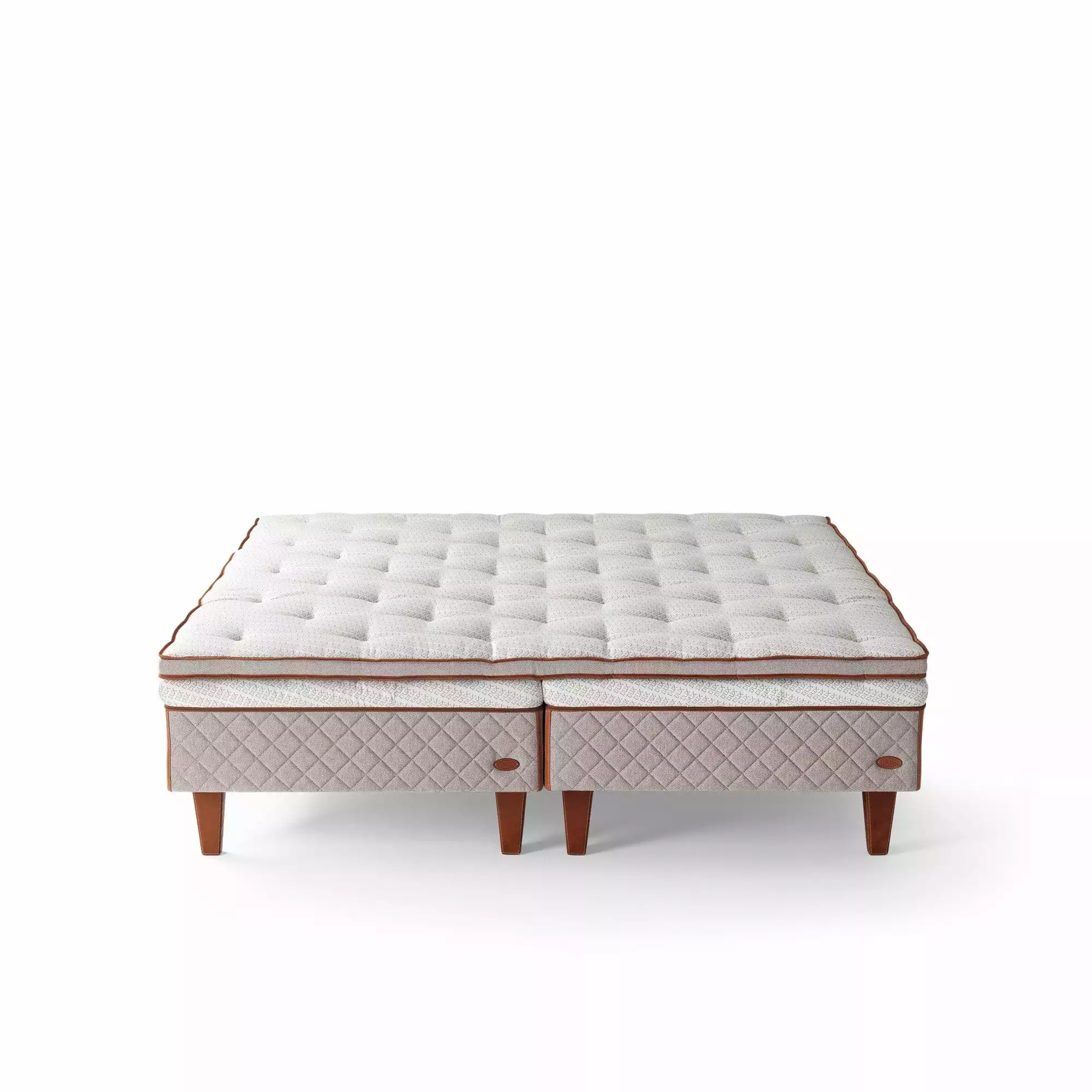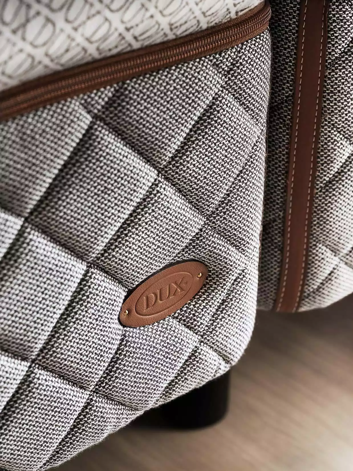 DUX 2002 är en dubbelfjädrad ramsäng med 9 cm + 12 cm höga spiraler samt en, med enkel dragkedja, unik avtagbar topp stoppad med en mjuk och häftad naturlatex för oslagbar komfort. Sängen finns i medium eller fast utförande och har en madrasshöjd på 26 cm.