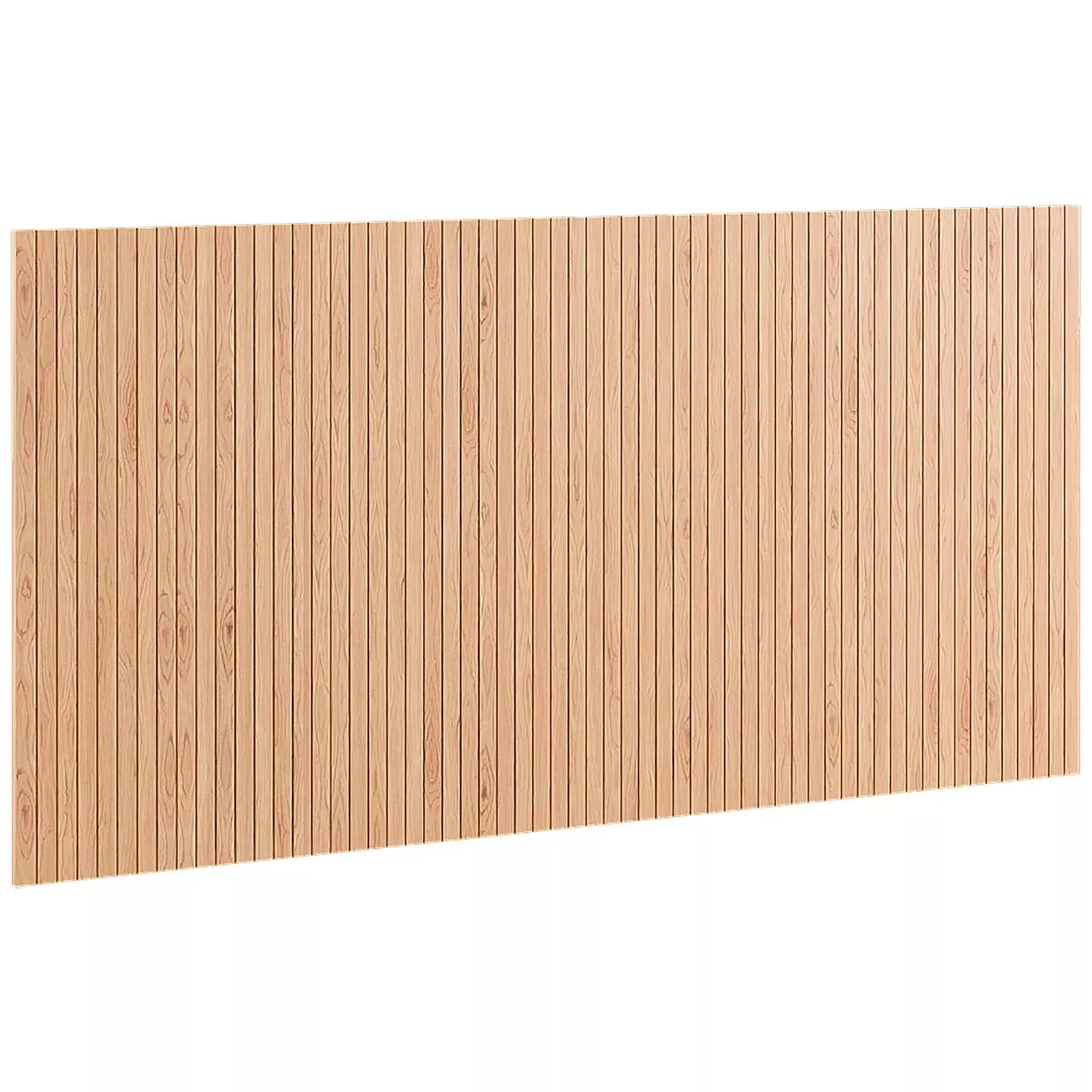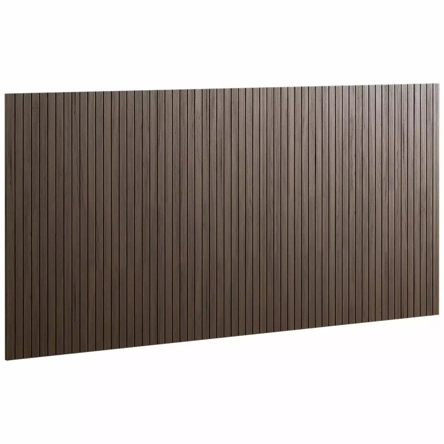 Vägghängd träsänggavel från Hilding. Gaveln liknar en panel med ribbor och spår. Gaveln kan kompletteras med sidopaneler med sängbord i samma utförande som monteras bredvid gaveln. Man får då en maffig väggpanel med väggmonterade sängbord.