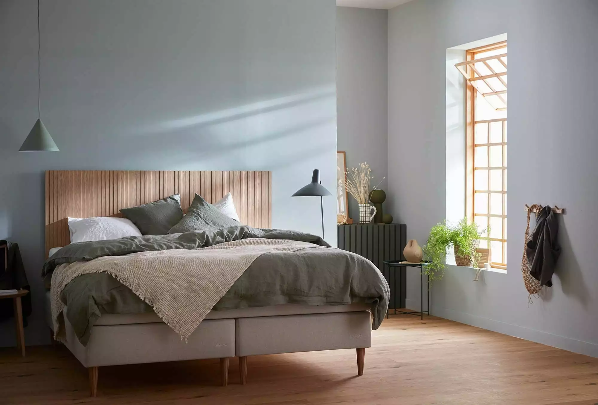 I 210 cm bredd är gaveln tvådelad, den får en skarv i mitten likt skarvarna som är mot sängbordspanelerna.