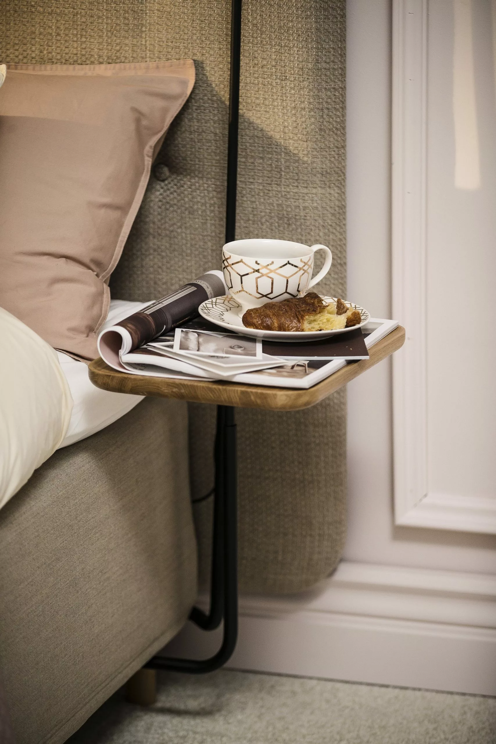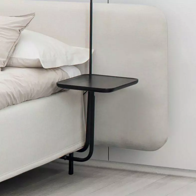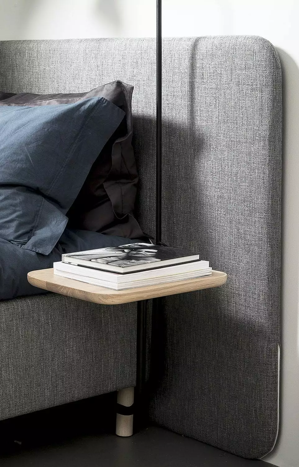 Add-On sängbord i svartbetsad ek från Jensen fästs under sängen i träramen.
