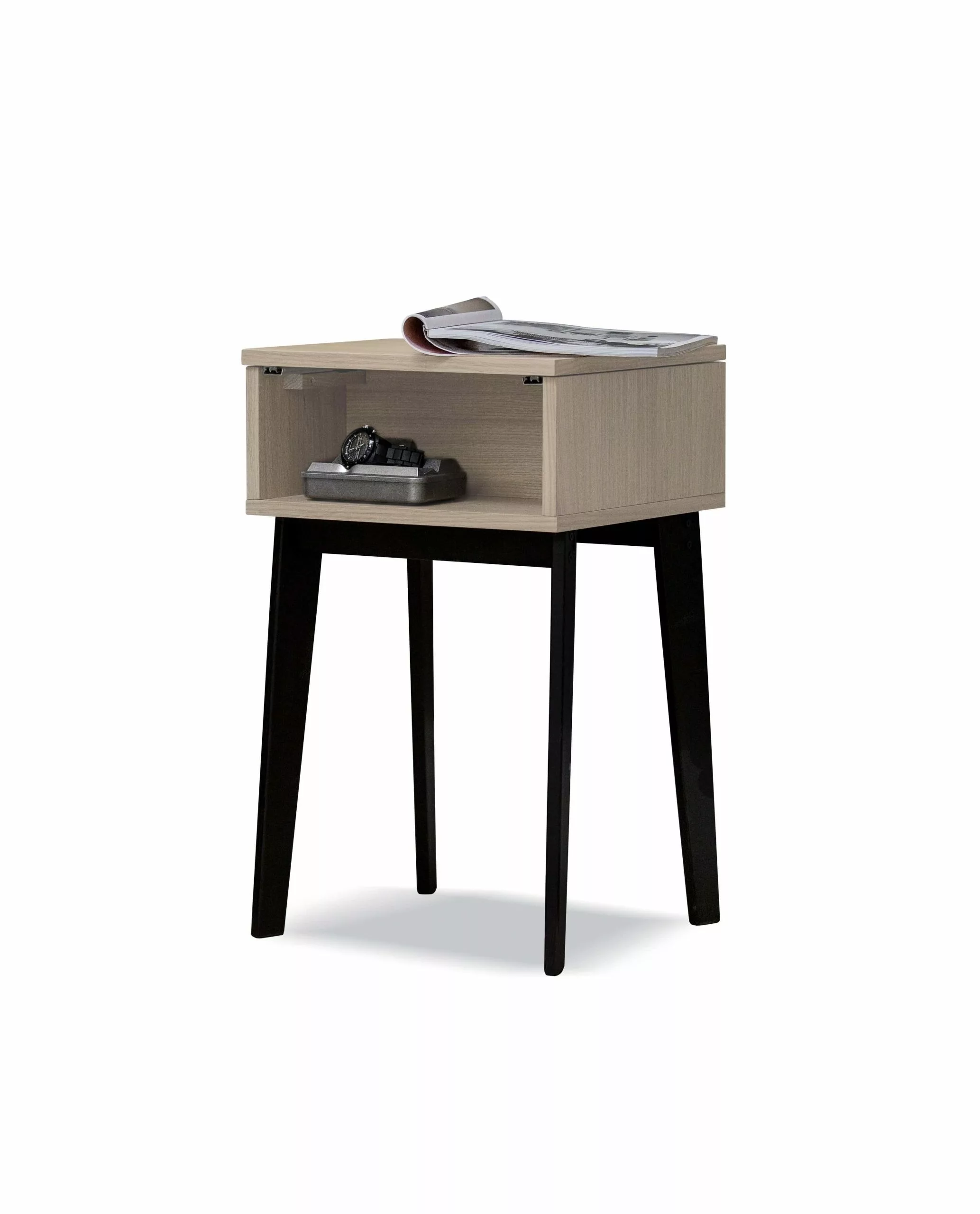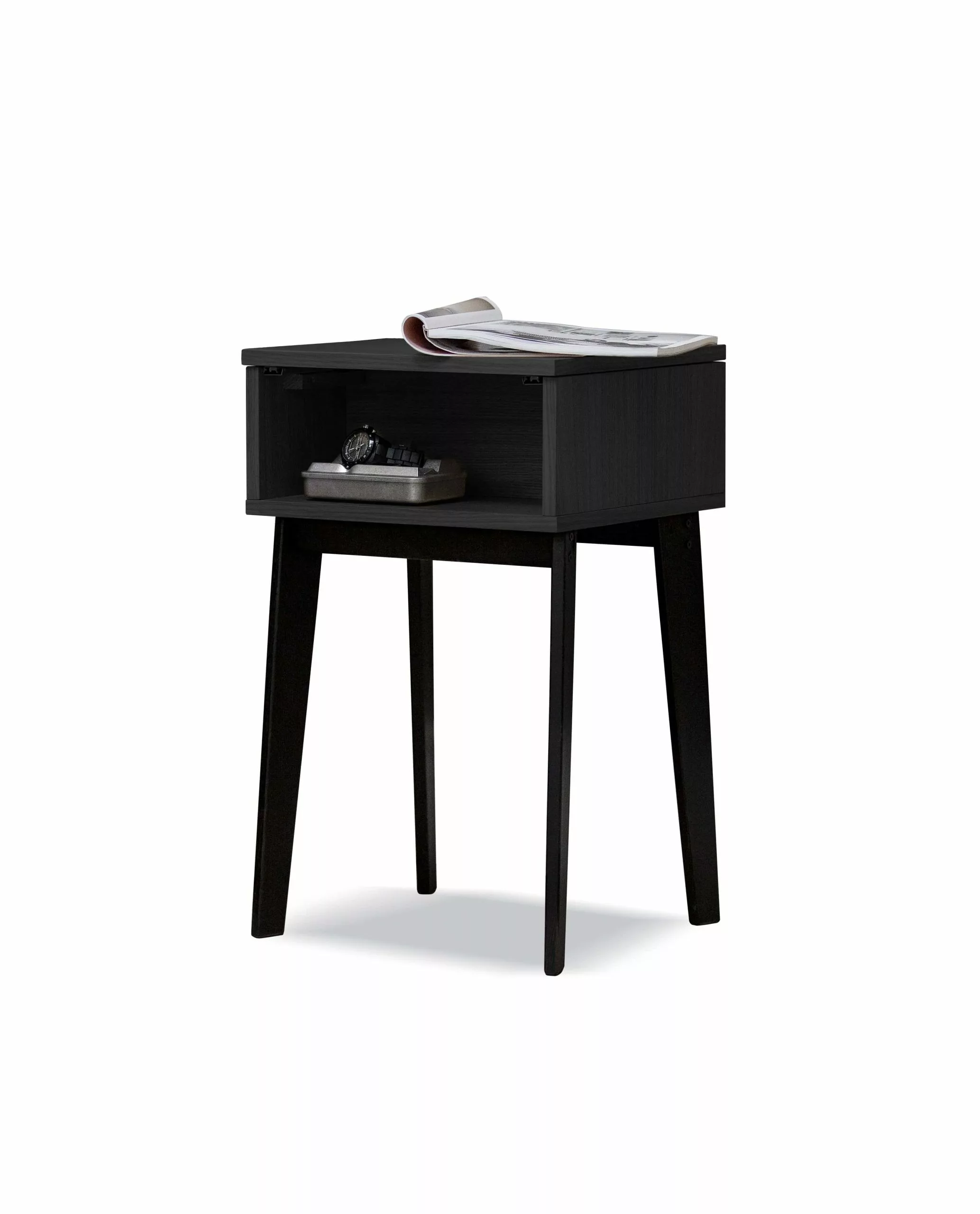 Nattbord med överdel i oljad, vitlaserad eller svartbetsad ek. Svarta ben i samtliga utföranden. Med dolt utrymme för förvaring. Mått: B39 x D35 x H62 cm