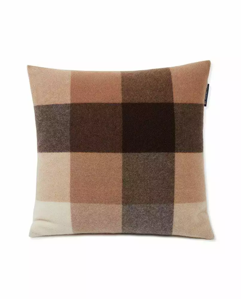 Rutigt, blockmönstrat kuddfodral tillverkat i Italien av en luftig blandning av återvunnen och ny ull. Det mjuka kuddfodralet fulländas av varumärkets logga i hörnet och en dold dragkedja längst ner.