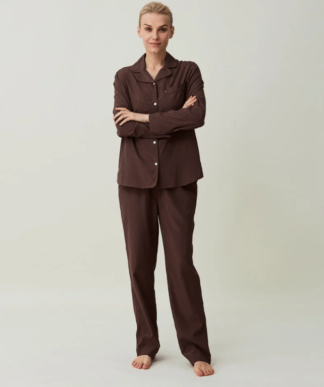 Sov gott i vårt jaquardprickiga pyjamasset Melinda i viskos och bomull. Det eleganta setet har en skjorta med långa ärmar, knappstängning fram och passpoaldetaljer runt krage och bröstficka. Pyjamasbyxorna har en bekväm, medelhög midja med elastiskt band och sidfickor. Viskosen har en silkesliknande lyster och underbar mjukhet. Tillsatsen av lätt bomull låter tyget andas och ger dig det bästa av båda världar.