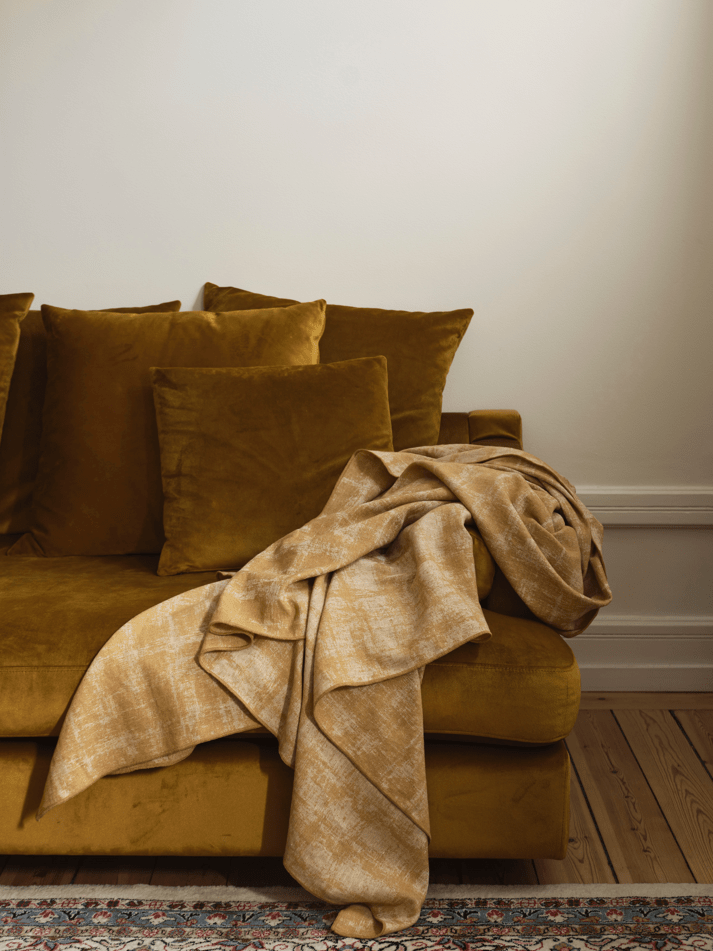 Vävd i ett abstrakt mönster i gult och off white. Tunnare pläd med struktur och fint fall. Generös storlek (140×220) som även kan användas som ett överkast vid fotändan av sängen. Stitching längs kanterna som ger ett modernt intryck.