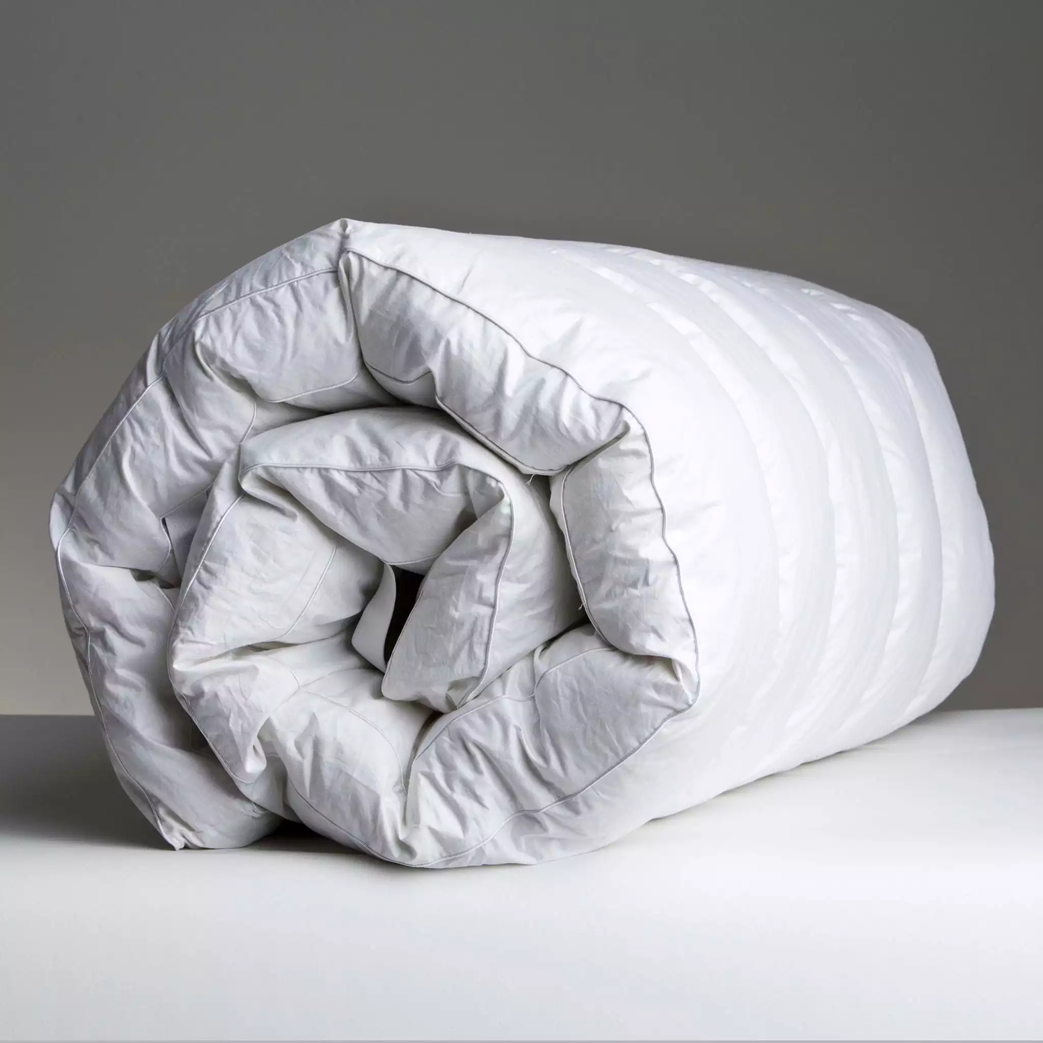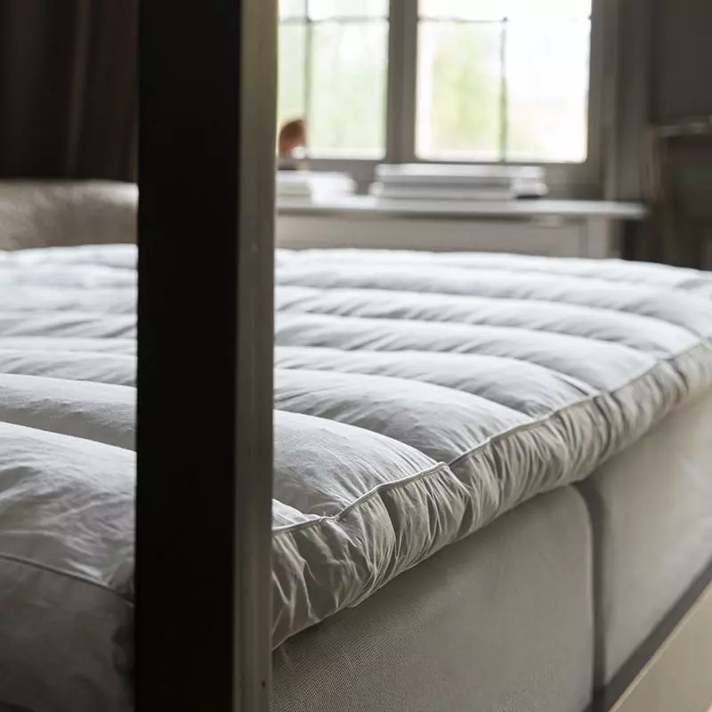 Den är fylld med 90% gåsfjäder och 10% gåsdun. Du kan antingen lägga den direkt på resårsängen eller använda den som komplement ovanpå din bäddmadrass.