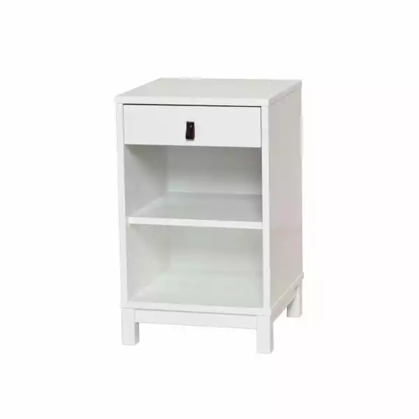 Svaneholm sängbord är ett smakfullt sängbord i vitaste vit med fina läderhandtag. Vitt är tidlöst och alltid modernt, och detta sängbord kommer passa utmärkt i lägenheten i city eller i loftsovrummet ute på gården. Handtaget är lätt att byta ut för dig som önskar ge ditt sängbord en annan känsla. Den har goda förvaringsmöjligheter med en låda och två hyllplan för att stuva undan dina nattliga väsentligheter, din favoritbok, väckarklockan och sänglampan.